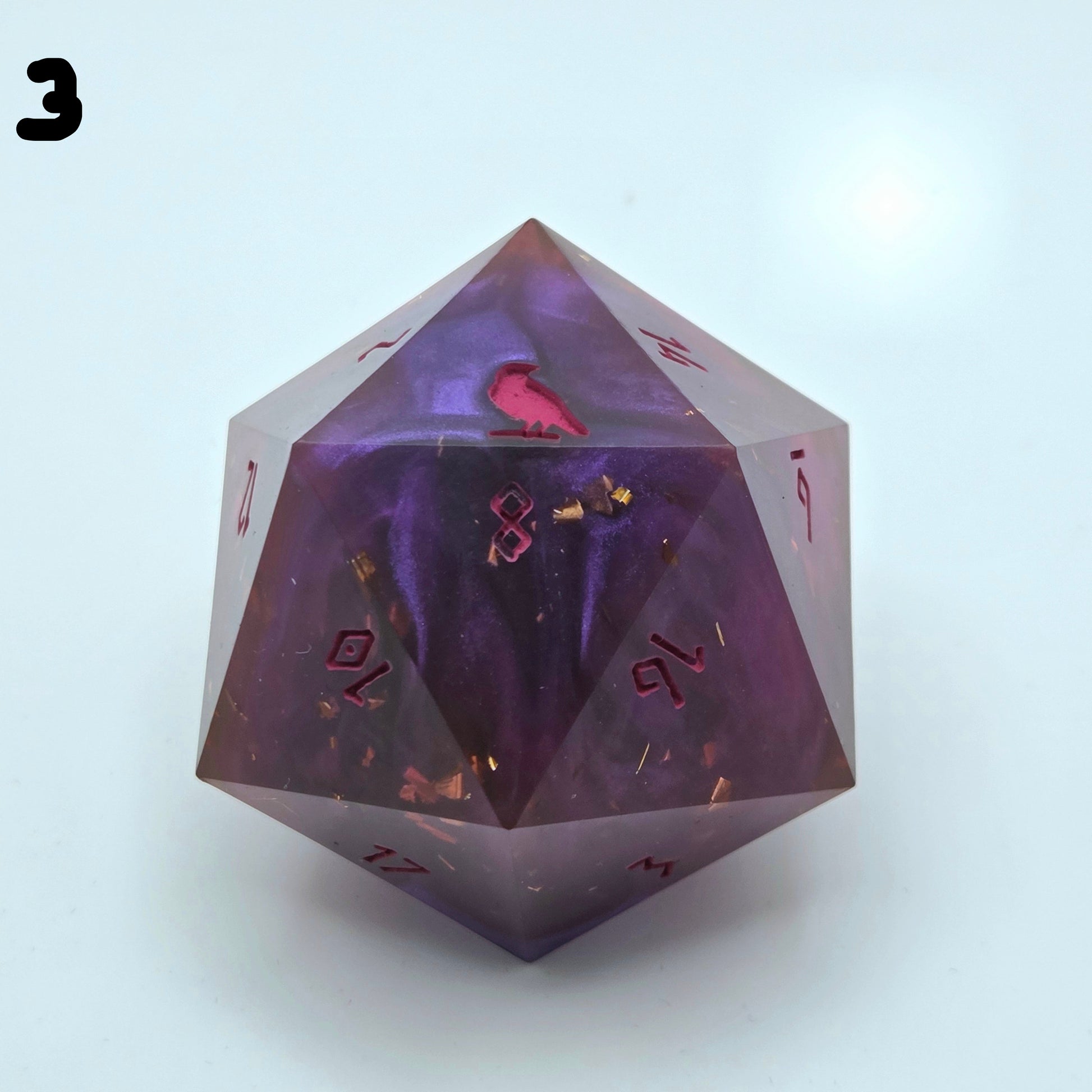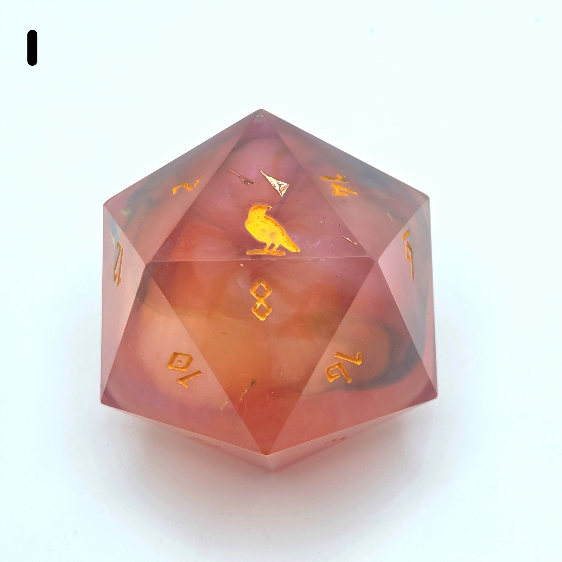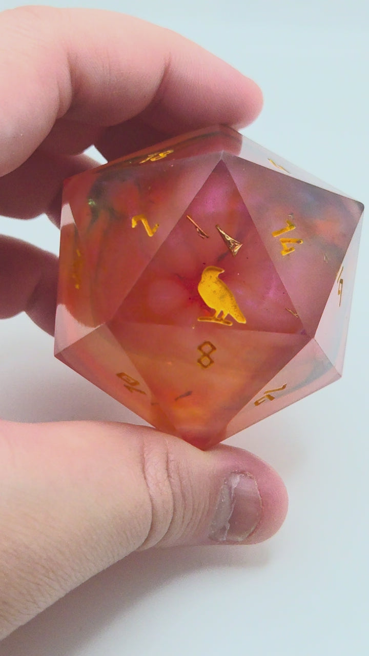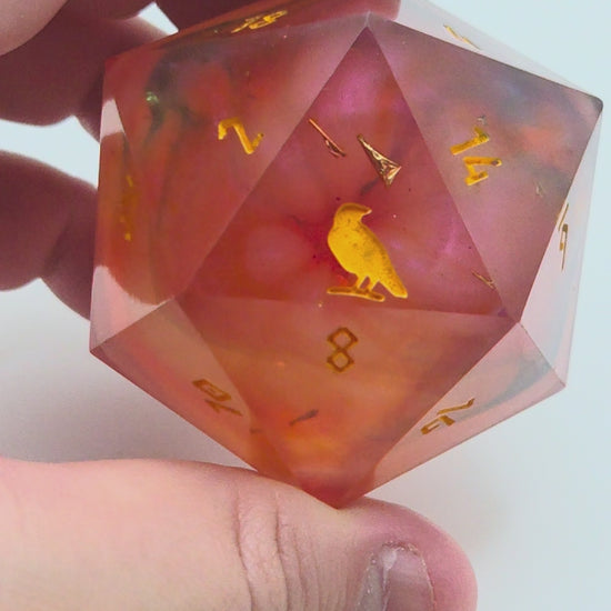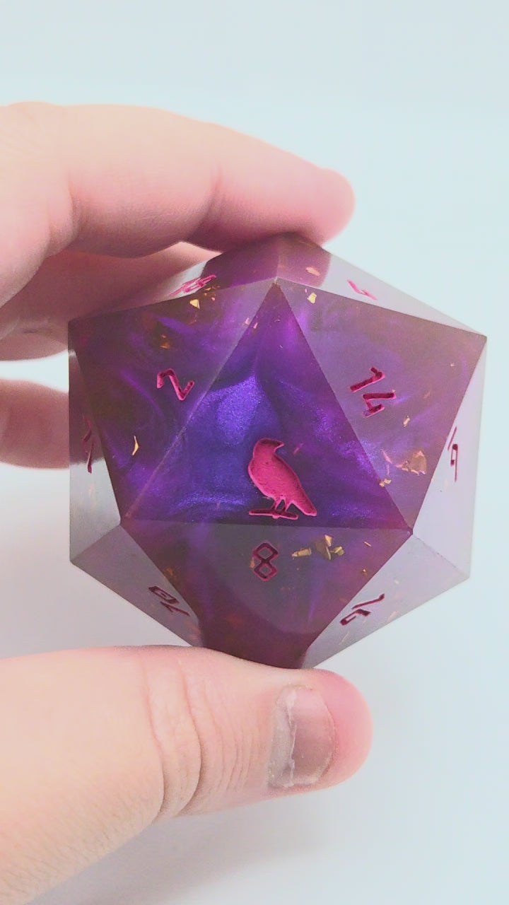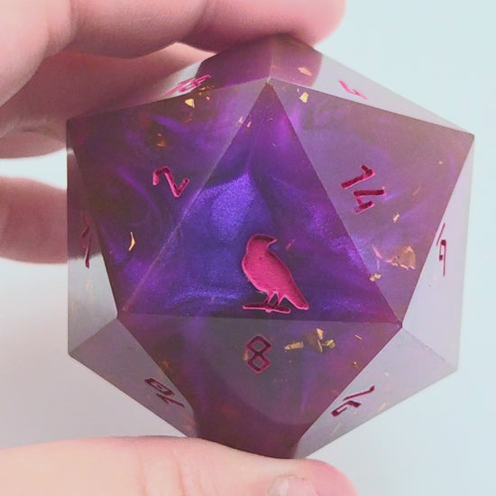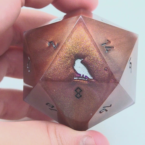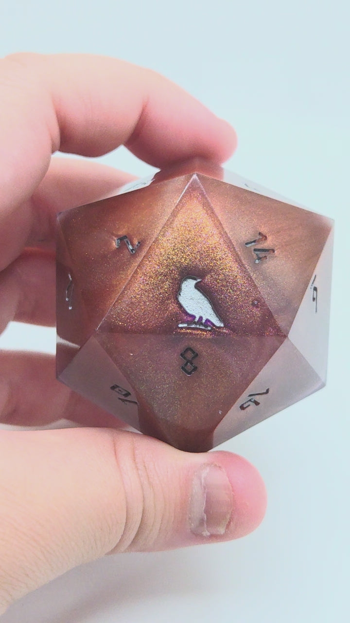 This item includes 1 45mm D20 chonk that includes Raven & Quill's logo as the high face (20).