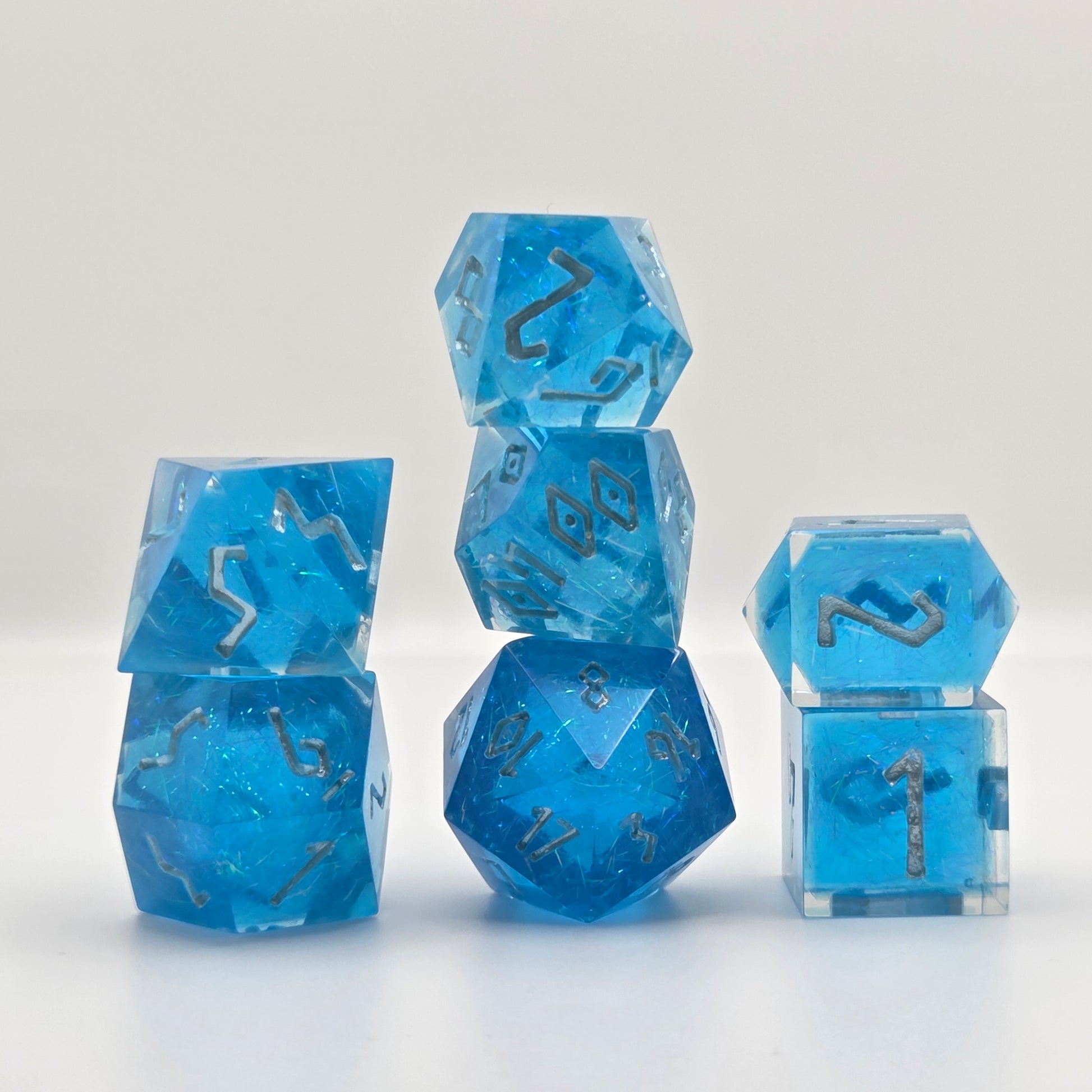 This item includes 1 standard d20 with special logo on high face, 1 rhombic-style d12, 1 d%, 1 d10, 1 d8, 1 d6, and 1 short crystal-style d4. These dice are perfect for use in tabletop games such as Dungeons & Dragons or Pathfinder.