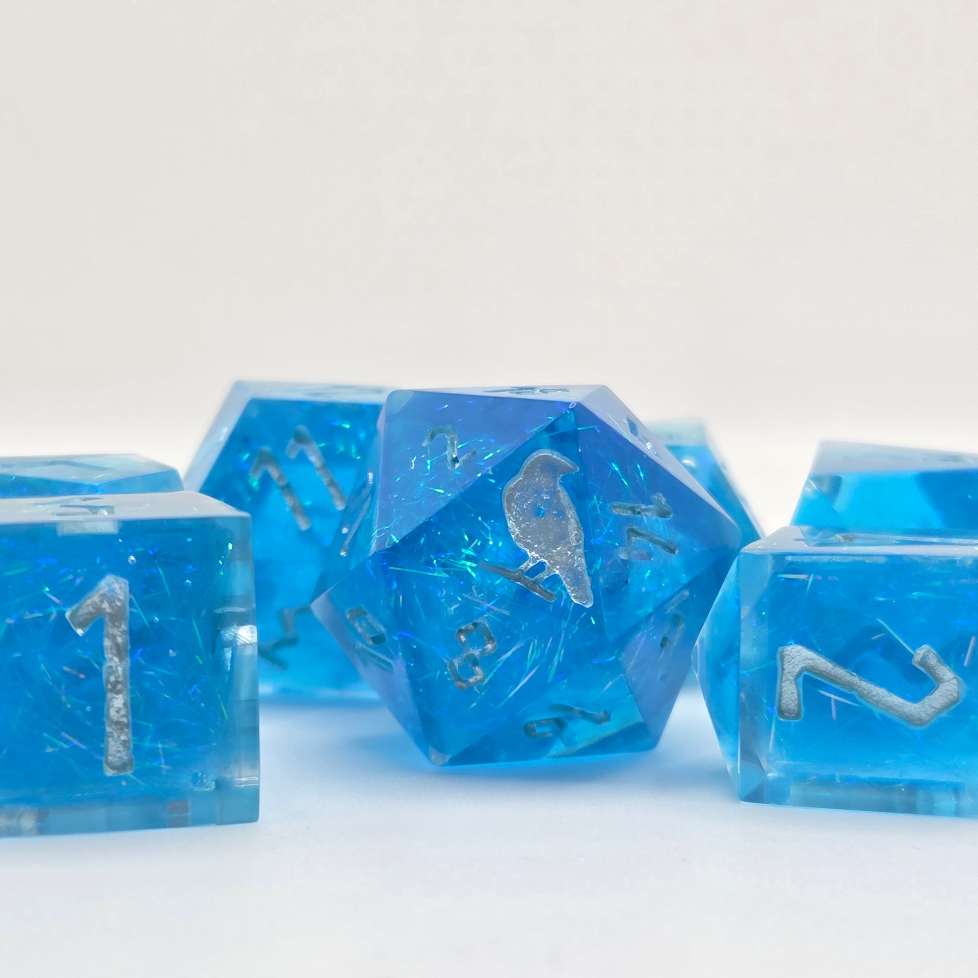 This set includes a short crystal-style d4, a rhombic-style d12, and a d20 with Raven & Quill's custom logo on the high face.