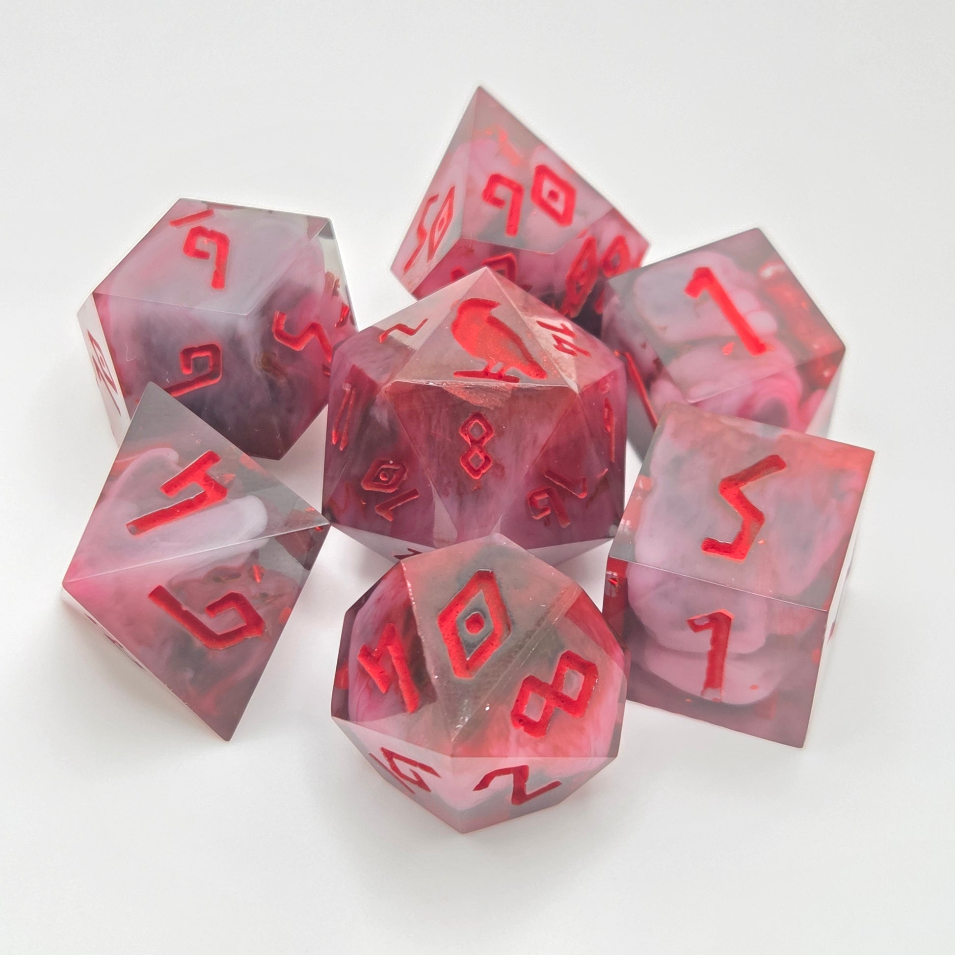 This set includes a short crystal-style d4, a rhombic-style d12, and a d20 with Raven & Quill's custom logo on the high face.